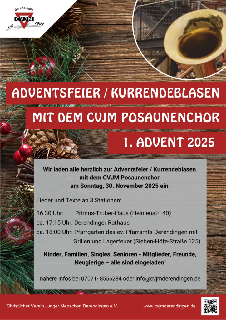 Wir laden herzlich zur Adventsfeier mit dem CVJM-Posaunenchor am Sonntag, 30. November 2025 ein. An drei Stationen in Derendingen gestalten wir Lieder und kurze Impulse zum Start in die Adventszeit: